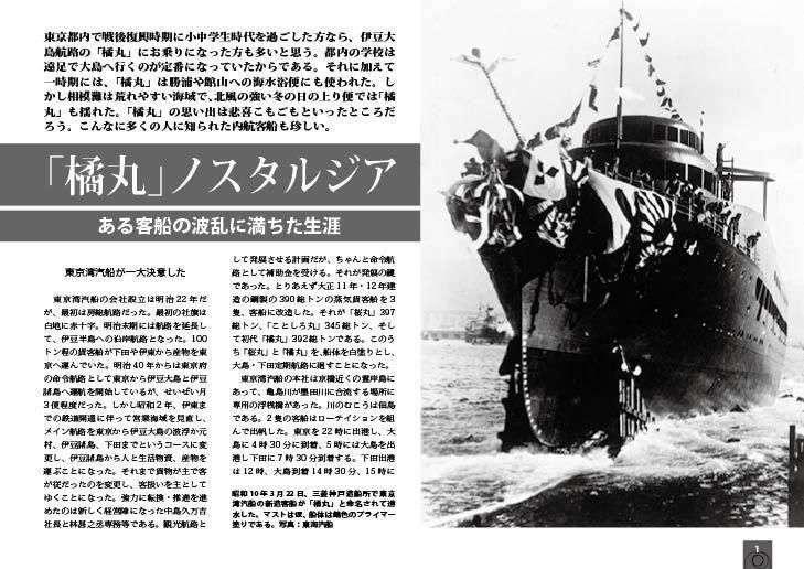 東京都内で戦後復興時期に小中学生時代を過ごした方なら、伊豆大島航路の「橘丸」にお乗りになった方も多いと思う。都内の学校は遠足で大島へ行くのが定番になっていたからである。それに加えて 一時期には、「橘丸」は勝浦や館山への海水浴便にも使われた。しかし相模灘は荒れやすい海域で、北風の強い冬の日の上り便では「橘丸」も揺れた。「橘丸」の思い出は悲喜こもごもといったところだ ろう。こんなに多くの人に知られた内航客船も珍しい。